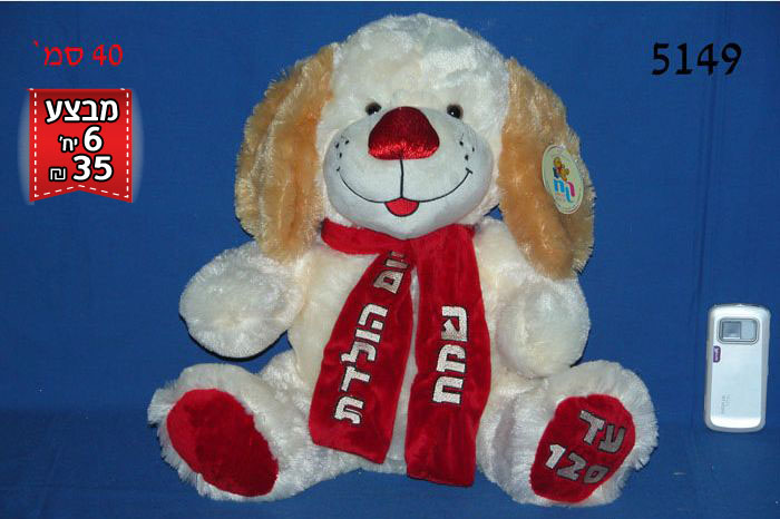 כלב קרם עם צעיף אדום יום הולדת עבר' 40 ס"מ