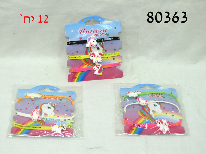 סט 3 צמידים דקים צבעוניים+חד קרן/12