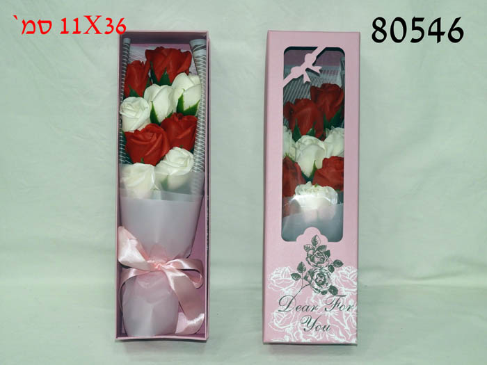 סידור פרחי סבון אדום/לבן בק.מתנה 11X36 ס"מ