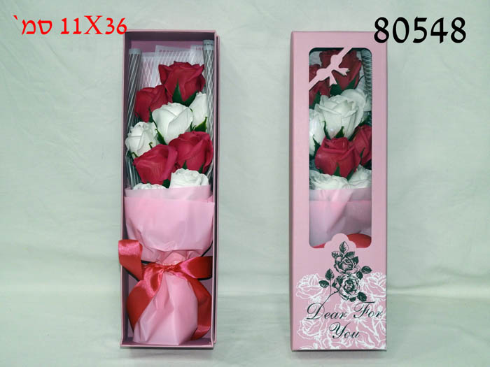 סידור פרחי סבון פוקסיה/לבן בק.מתנה 11X36 ס"מ