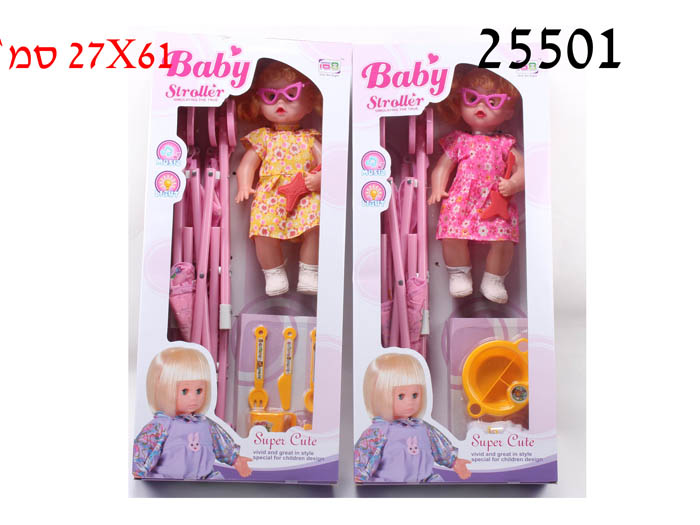עגלה ורודה עם הדפס ובובה+אביזרים במזוודה 27X61